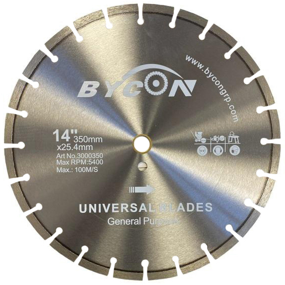 Алмазный диск 350 мм BYCON Universal, посадочное отверстие: 25.4/20 мм, высота сегмента 10 мм для резки бетона, бордюрного камня, твердого кирпича, других твердых строительных материалов.