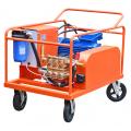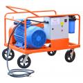 тележка на 4-х цельнорезиновых большегрузных поворотных колесах, насос ВД 600 бар при 40 л/мин, электродвигатель 37 кВт, 380 В, 50 Гц, соединение с насосом - ременная передача, регулятор давления By-Pass, предохранительный клапан, защита от сухого пуска, защита от перегрева насоса (термоклапан), манометр 0 - 1000 бар нерж., пускатель с защитой от перегрева Schneider Electric, фильтр очистки воды 50 мкн, выход М22х1,5, шланг высокого давления 10 мм - 15 м арт. 3SPC-15-10-3/8-700, пистолет арт. 203600550, копье 800 мм арт. 512359, улучшенная форсунка 15 град. арт. 613505