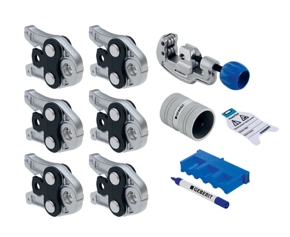 Стандартные обжимные клещи типа М ø: 15 / 18 / 22 / 28 / 35 мм. В комплекте с труборезом, фаскоснимателем и шаблоном для маркировки на трубе глубины раструба, с маркером, в кейсе. Для прессовых инструментов с совместимостью Geberit [2].