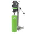 Установка алмазного сверления Eibenstock DB 200 (0B33E000), без функции наклона стойки, комплектуется односкоростным мотором мощностью 2500 Вт. Обороты шпинделя установки составляют 675 об/мин на холостом ходе и 450 об/мин под нагрузкой. С помощью Eibenstock DB 200 можно осуществлять сверление отверстий в кирпиче, бетоне, в армированном бетоне диаметром до 200 мм. Для подсоединения коронки шпиндель Eibenstock DB 200 имеет полудюймовую внутреннюю резьбу (½") и наружную резьбу 1 ¼". Также в шпиндель интегрирован адаптер для подачи воды с краником, который регулирует ее объем при сверлении. Eibenstock DB 200 комплектуется стойкой без возможности изменения угла сверления (только под углом 90°). Высота стойки 790 мм, максимальный рабочий ход мотора 550 мм. Ручка, которой осуществляется подача мотора, в процессе сверления, может устанавливаться как справа, так и слева. Мотор, которым укомплектована Eibenstock DB 200, имеет защитную муфту сцепления, которая срабатывает в момент заклинивания коронки. Таким образом защищается от повреждения как мотор, так и коронка. Редуктор двигателя находится в масляной ванне, чем обеспечивается его оптимальная смазка. Кроме того, щетки мотора, при износе, самоотключаются. Полиуретановый сетевой кабель Eibenstock DB 200 снабжен устройством защитного отключения (PRCD), которое защитит оператора от поражения электрическим током. Для запуска установки нажмите кнопку RESET на пульте отключения PRCD, после чего на нем загорится индикация, сигнализирующая о том, что защитная функция включена и только после этого можно запускать установку. В стандартную комплектацию Eibenstock DB 200 входит пластиковый бак под воду на 5 л с быстросъёмным соединением на шланге, а также комплект из 10 дюбелей и крепежного винта. Вес оборудования 15,5 кг, поставляется в картонной коробке.