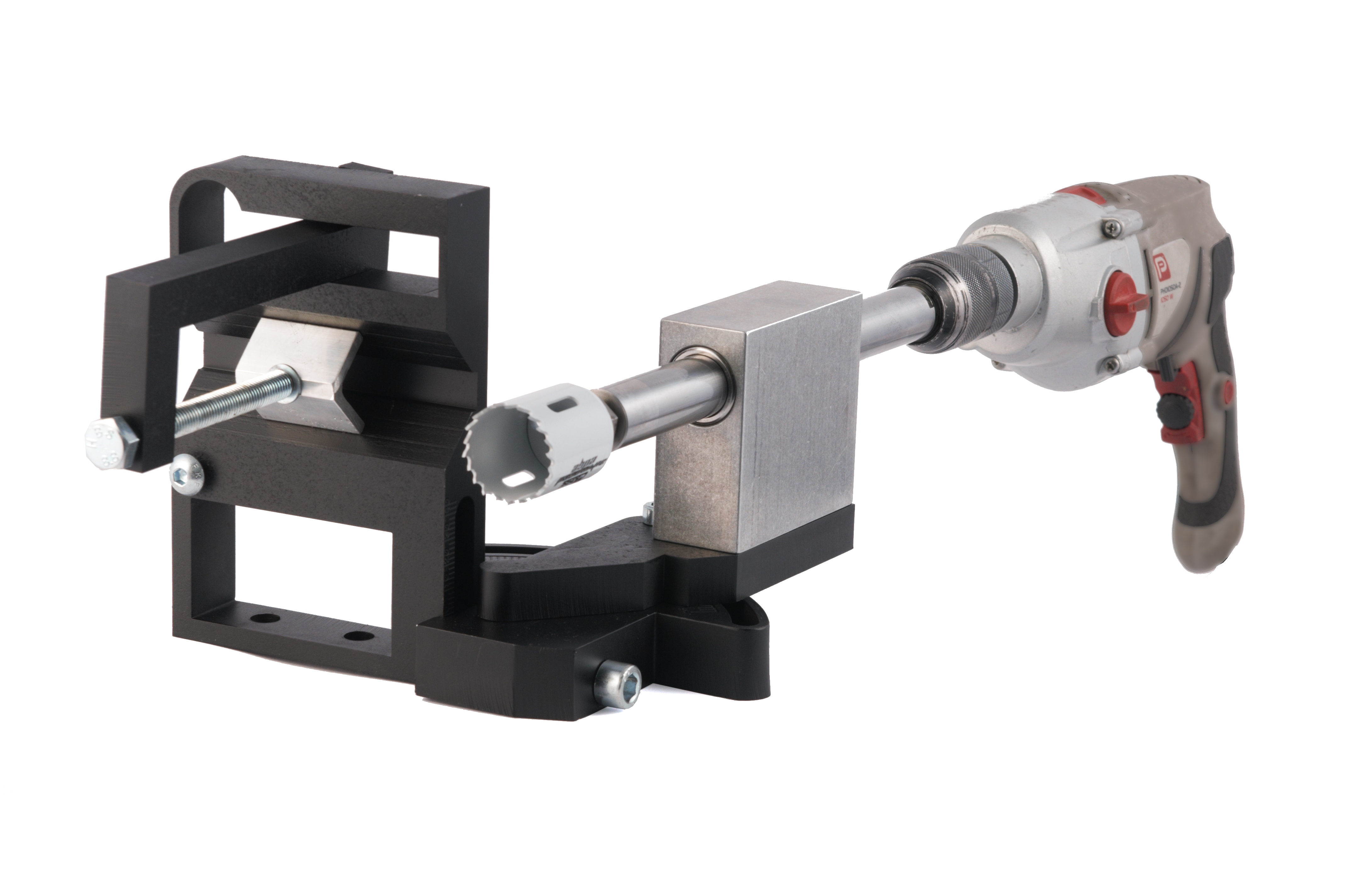 Устройство также позволяет бурение под любым углом в диапазоне от 0 до 50 градусов. Настройки можно точно отрегулировать. В качестве привода лучше всего использовать дрели с переменной скоростью. Особенно при бурении в трубах из нержавеющей стали необходима плавная регулировка (например, при сверлении труб диаметром 40 мм из нержавеющей стали рекомендована скорость вращения дрели не более, чем 110 об / мин).